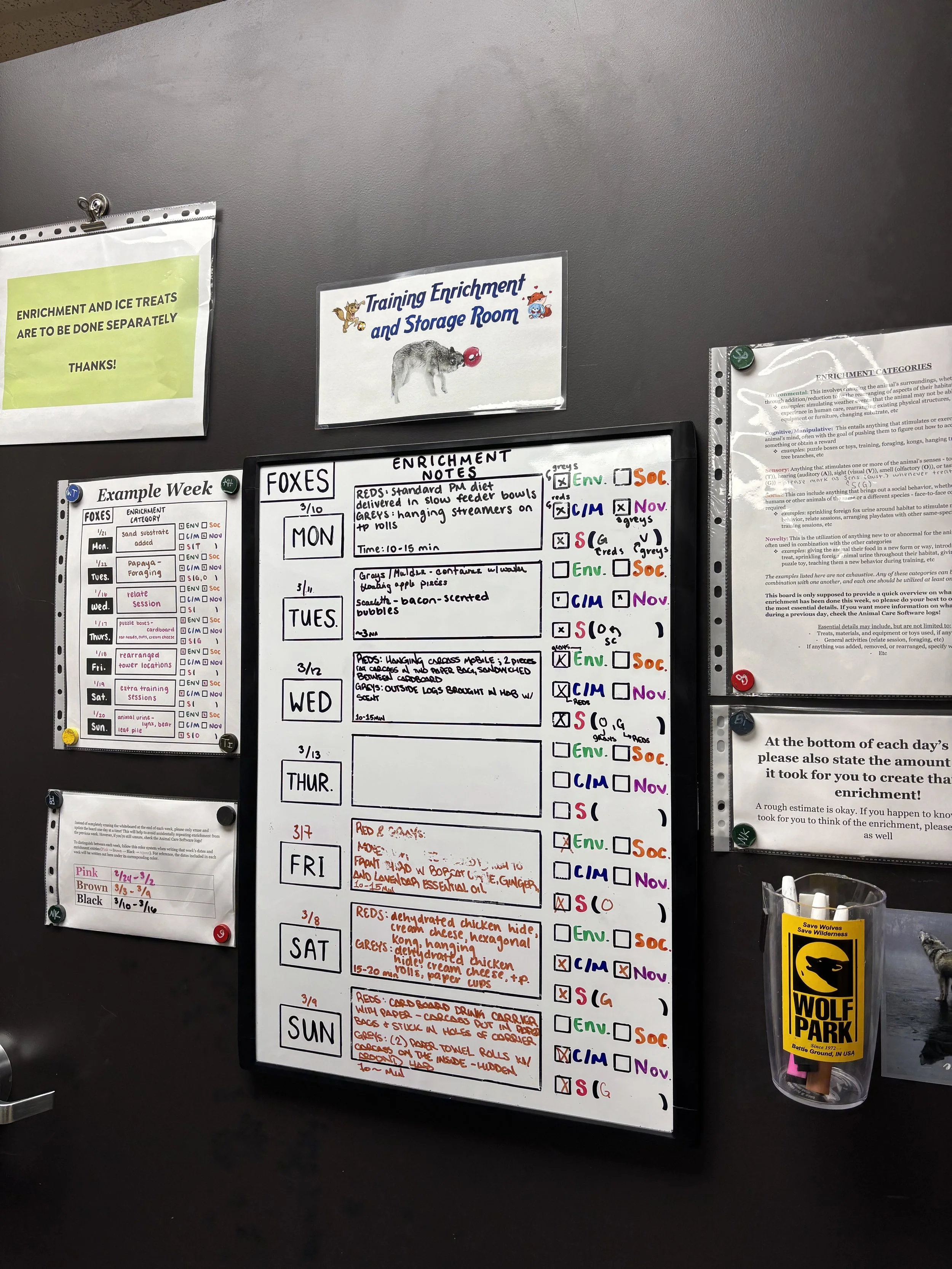 I wish we had captured some photos of the interaction. Having not observed Red Foxes before it was fascinating to see how their behavior differed from that of the wolves and how quickly and readily they interacted with the enrichment items.