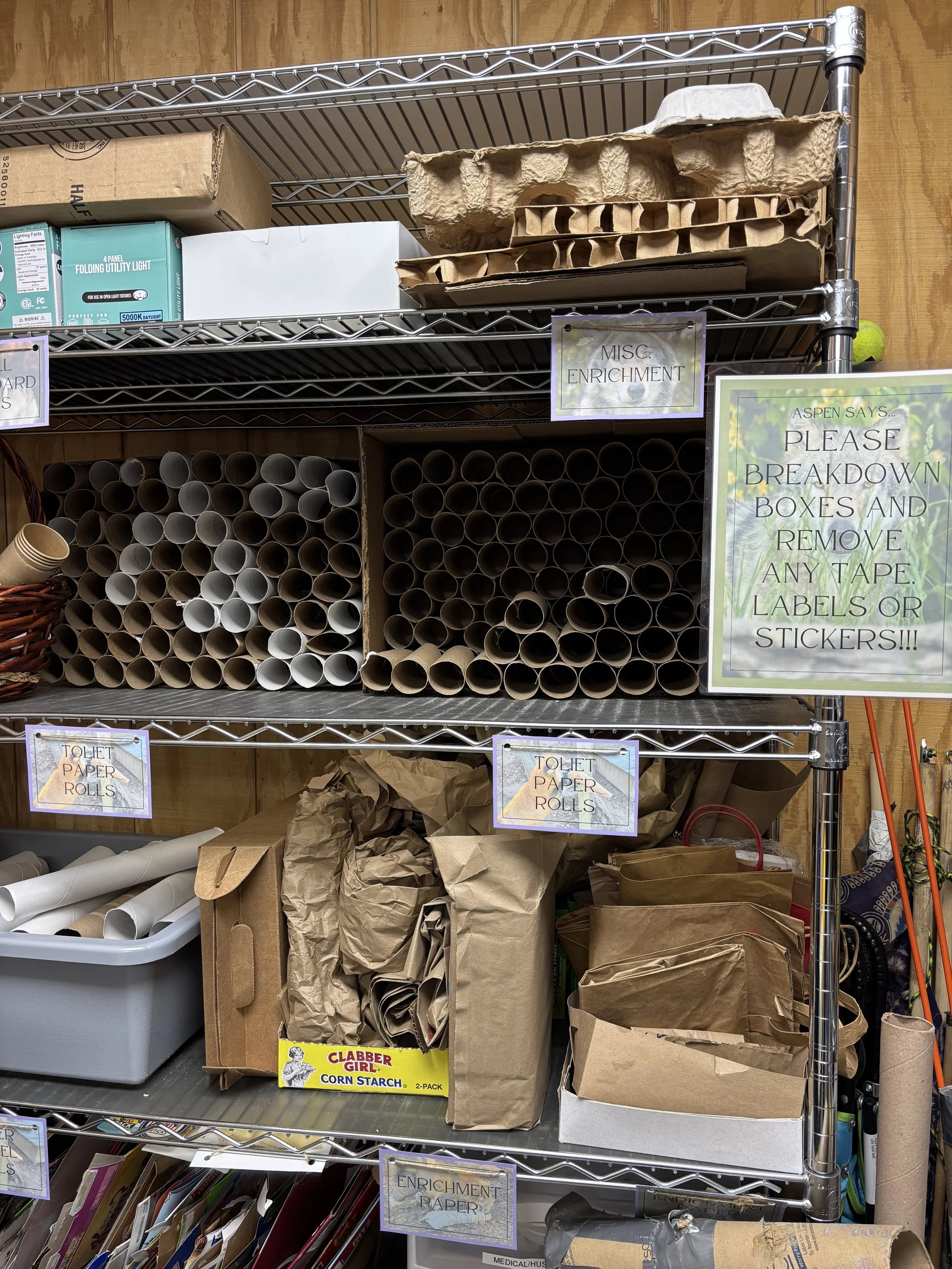 Another area of emphasis during our visit was enrichment. Wolf Park interns, staff, and volunteers work hard to create enrichment plans for each species in general and each individual specifically. During our visit, we were fortunate to observe a neat enrichment activity provided to Mulder and Scarlet, the sanctuary’s two Red Foxes. They had created a bundle of sticks inserted into toilet paper tubes with feathers stuck to the outsides. These little creations were hung from branches in the animals’ enclosures and were designed to mimic potential prey for red foxes.